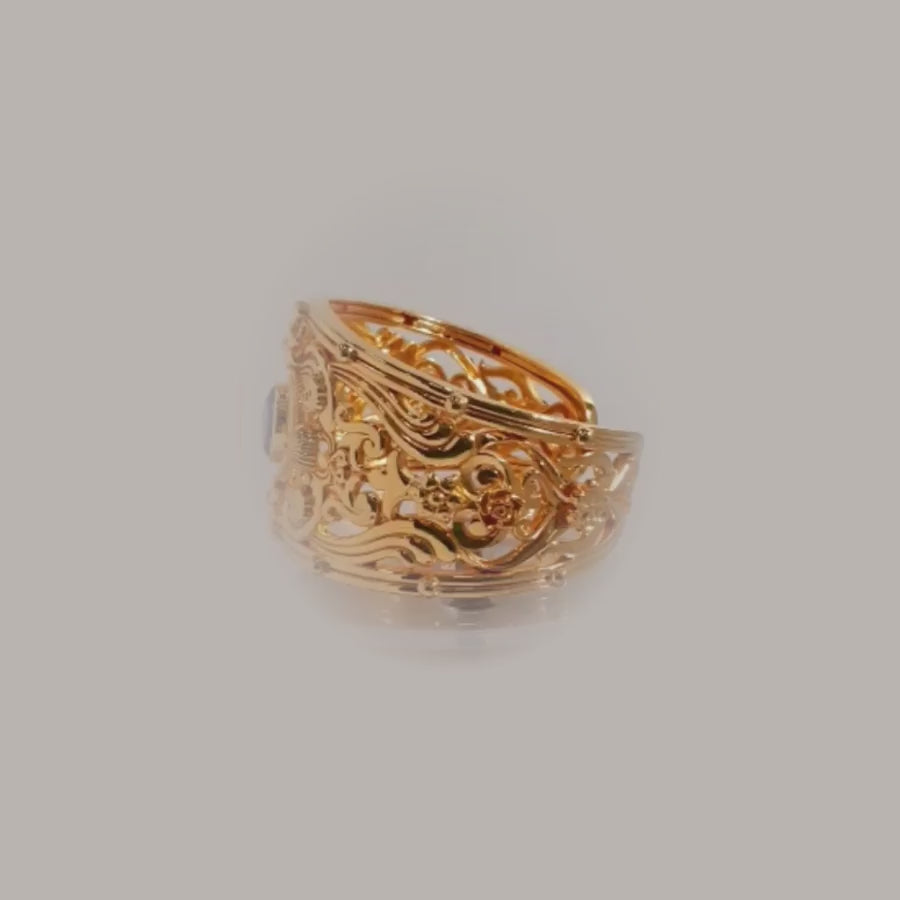 A beautifully crafted gold bracelet featuring intricate filigree detailing. The design showcases elegant scrollwork that adds a regal touch. At the center sits a striking deep-blue gemstone, creating a bold focal point. A perfect blend of traditional artistry and timeless luxury.